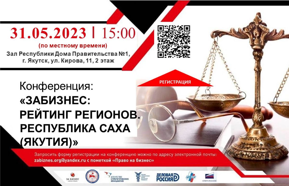 Завтра, 31 мая, в 15:00 ч. в г. Якутске в Доме Правительства №1 пройдет Всероссийская конференция для предпринимателей «ЗАБИЗНЕС: рейтинг регионов. Республика Саха (Якутия)». Участники соберутся на общей площадке, чтобы обсудить актуальные вопросы, такие как давление на бизнес со стороны контрольно-надзорных органов и новые стандарты работы органов власти с обращениями предпринимателей.